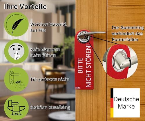 3,0 von 5 Sternen Gut lesbare Türschilder, leider gibt es keine Gummierung der BefestigungsringeEs werden zwei Türschilder geliefert, die jeweils auf der einen Seite mit "Bitte nicht stören !" und auf der anderen Seite mit "Bitte klopfen !" bedruckt sind. Die Schrift ist sehr klar und gut lesbar, die Verarbeitung der Schilder selbst ist ebenfalls einwandfrei. Kritik gibt es bei der Türbefestigung, welche mit einem Metallring erfolgt. Bei Lieferung waren die Metallringe zwar glatt und kantenfrei, jedoch hatte man beim Anfassen einige glitzernde, nicht scharfkantige Metallspäne an den Fingern. Das ist nicht grundsätzlich schlimm, jedoch scheinen die Ringe nach dem Glattschleifen nicht ausreichend geputzt zu werden. Schlimmer ist die Tatsache, dass die Schilder zwar selbst aus einem filzartigen Material hergestellt sind und damit sehr türschonend sind, jedoch die Metallringe die Türklinken verkratzen, weil hier Metall auf Metall liegt. Wünschenswert wäre hier ein innenliegender Gummiring gewesen.