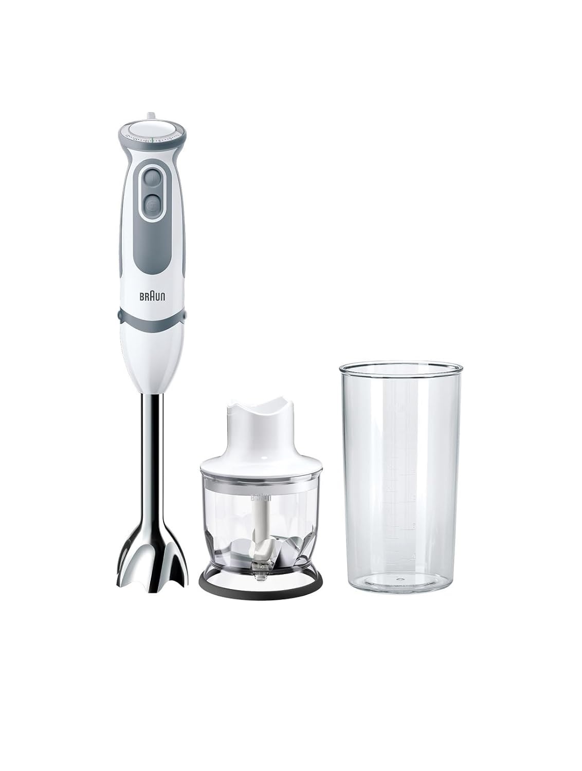 • LIEFERUMFANG: 1 x MultiQuick 5 Vario MQ 5220WH Stabmixer in Weiß mit Pürierstab und 350 ml Zerkleinerer sowie 600 ml Mixbecher von Braun