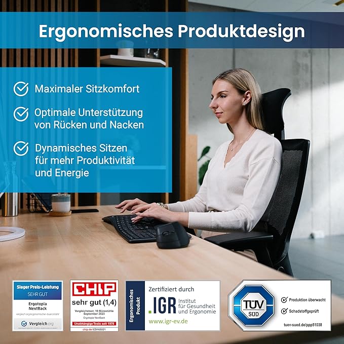 - Perfekt abgestimmte Ergonomie: Der Ergotopia NextBack Bürostuhl bietet dank präziser Synchron-Mechanik optimale Unterstützung. Sitzfläche und Rückenlehne passen sich jeder Bewegung an und fördern eine gesunde Körperhaltung.