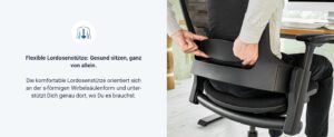 - Flexible Lordosenstütze: Die anpassbare Lordosenstütze unterstützt Deinen unteren Rücken und fördert eine natürliche S-förmige Wirbelsäulenhaltung. Verhindere Rückenschmerzen und sitze bequem durch individuell einstellbare Stützen.