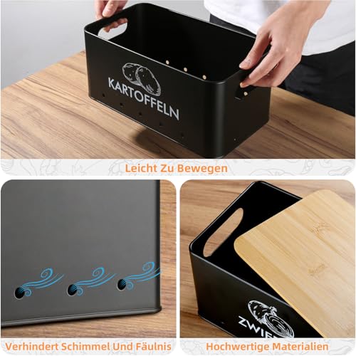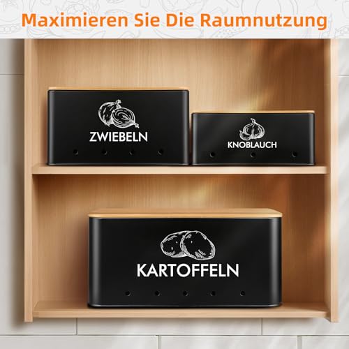 - 【EINE AUSGEZEICHNETE AUFBEWAHRUNGSLÖSUNG】Unser 3er Set bietet ultimativen Komfort mit drei großen Schwarzer Kartoffelbox für alle Ihre Aufbewahrungsbedürfnisse. Das schwarze Finish der Kartoffel Aufbewahrungsbox ergänzt und harmoniert perfekt mit jeder Kücheneinrichtung, komplett mit einem Bambusdeckel, der einen Hauch von Eleganz verleiht. Mit diesen Schwarzer Zwiebeln Aufbewahrung haben Sie einen ordentlichen, organisierten Küchenraum, der sowohl funktional als auch schön ist!