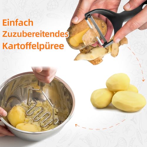 Das Set enthält außerdem zwei praktische Zubehörteile: einen Sparschäler und einen Kartoffelstampfer. Diese machen die Zubereitung von Kartoffelpüree so einfach! Der Stampfer funktioniert auch hervorragend für andere Gemüsepürees, sodass man immer frisch püriertes Gemüse genießen kann. Ein echtes Highlight, durch das die Verwendung dieser Boxen noch vielseitiger wird.