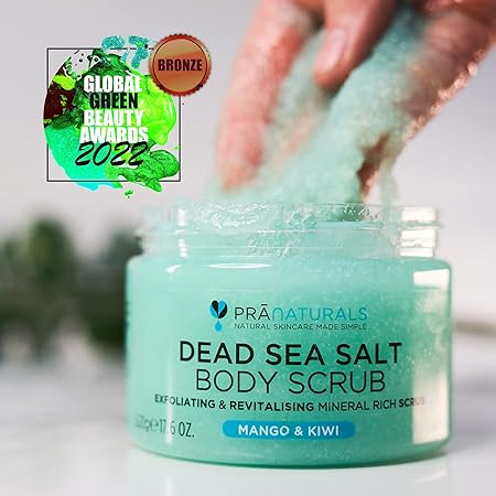 PraNaturals Körperpeeling mit Salz aus dem Toten Meer 500g – Feuchtigkeitsspendend & pflegend, Natürlichen Ölen & Mineralstoffen, keine Parabene, vegan, frei von Tierversuchen (Mango und Kiwi)